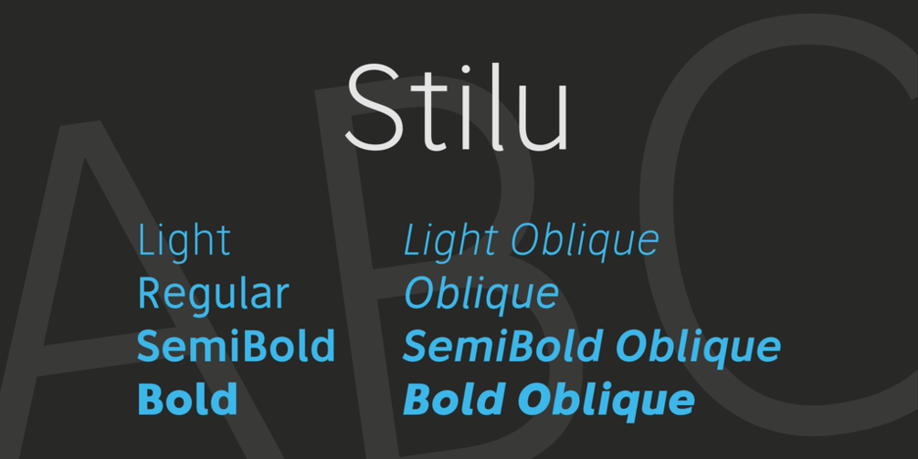 Stilu is a family of sans serif typefaces. In this package are four weights avalaible: Light, Regular, SemiBold and Bold plus obliques. OpenType features: ligatures, small caps, small caps figures, old style figures, proportional lining and tabular lining figures.